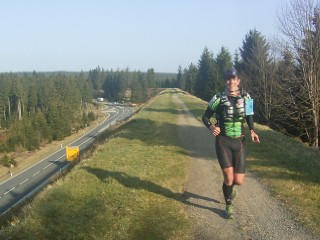 Das brachte wichtige Orientierung auf den ersten 39km bis Torfhaus. Nach dem Start um 6:15h anfangs in einer Vierer-Spitzengruppe bei schönstem Frühlingswetter laufend, wurde es schon bis zum ersten VP zu warm für Langärmeliges. |