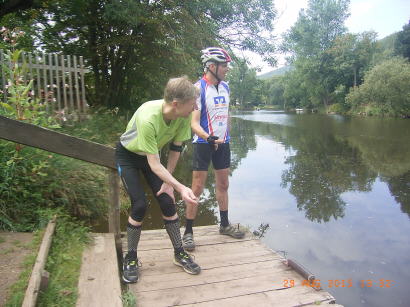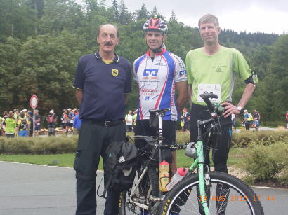 einer Wiederholung überreden. Diesmal qualitativ und quantitativ (83 Starter) etwas schwächer besetzt als bei der Premiere. Dennoch sind mit dem Sieger von 2013 Peter Flock oder dem Sieger des Hexenstiegs 2015 Michael Wagner und Anderen starke Favoriten angemeldet. Auch ich war wieder dabei und hoffte ein ähnlich gutes Ergebnis wie 2013 zu erzielen. Diesmal unterstützte ein Team aus Begleitradler Jens-Peter Schulz und Autofahrer Helmut Maul. Ich hoffte, dass dieser Vorteil die zum Wochenende angekündigte Hitze ausglich. |